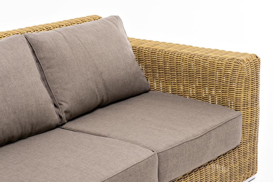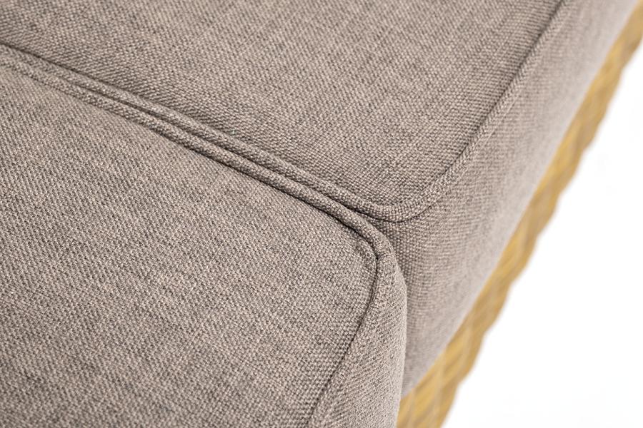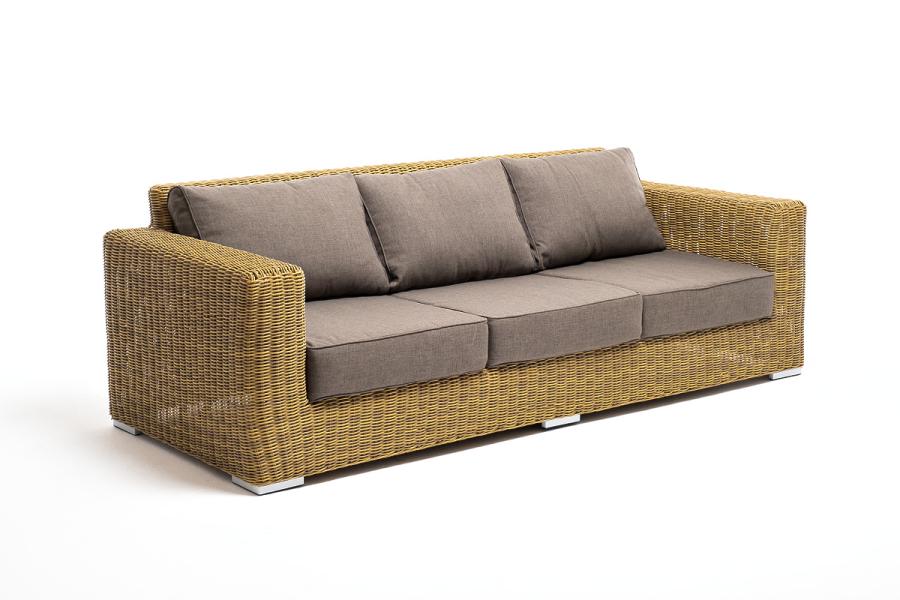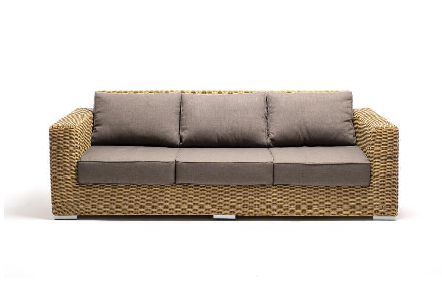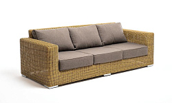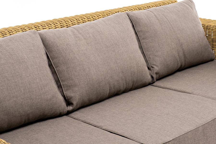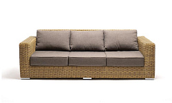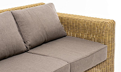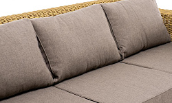 В комплекте с трехместным диваном идут мягкие подушки для комфортного расположения. Чехлы съёмные серо-коричневого цвета из высококлассного полиэстера с плотностью 230гр/м2. Защитные свойства ткани усиливаются при помощи влагоотталкивающей пропитки.