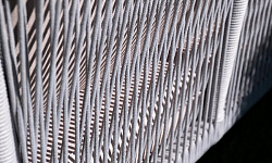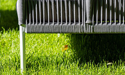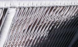 Диван имеет алюминиевый каркас, окрашенный порошковой краской в белый цвет. Боковины каркаса и спинка вручную оплетены роупом - эластичными синтетическими лентами, изготовленными из высокопрочных полиэфирных волокон. Цвет оплетки - светло-серый.