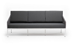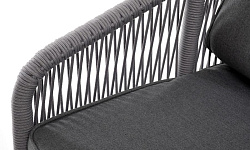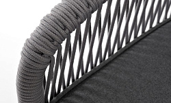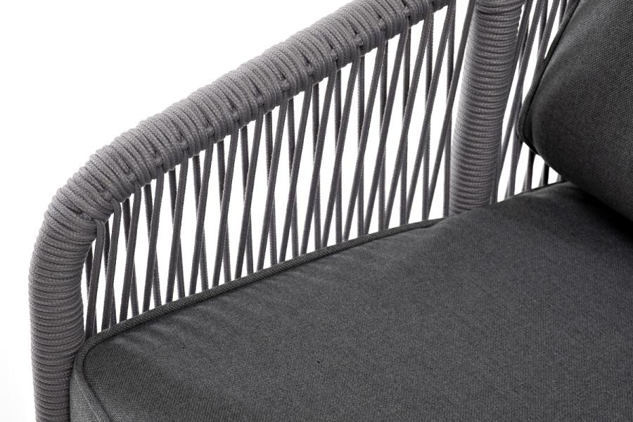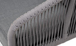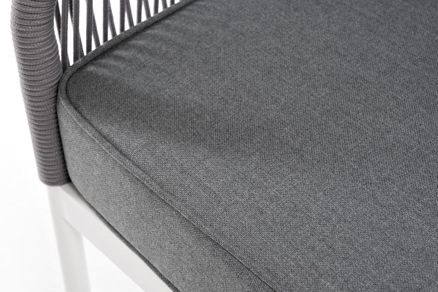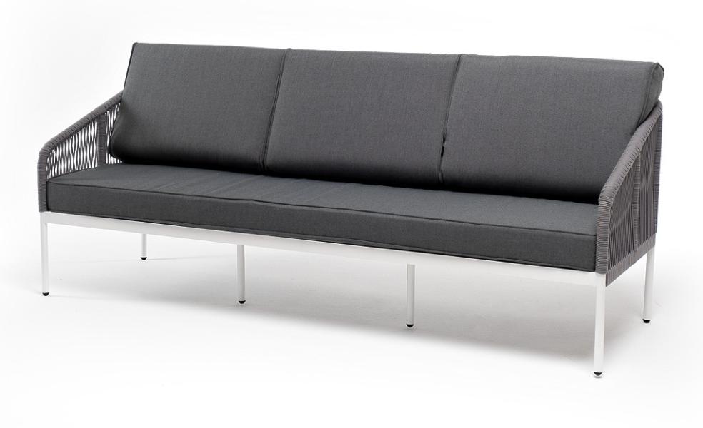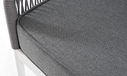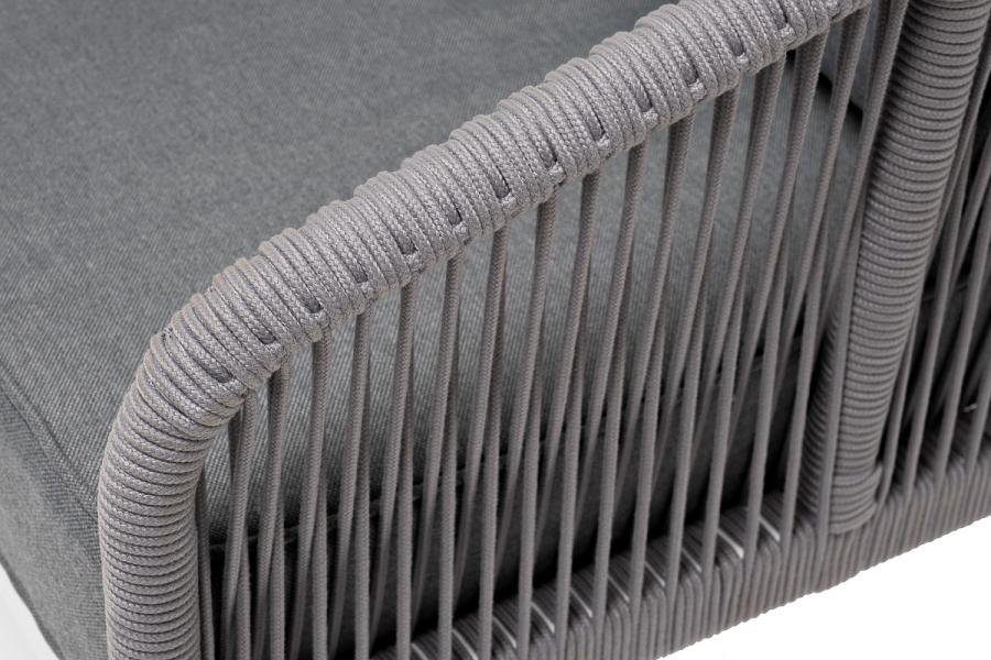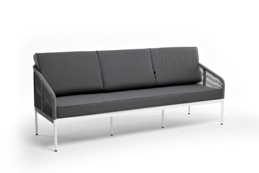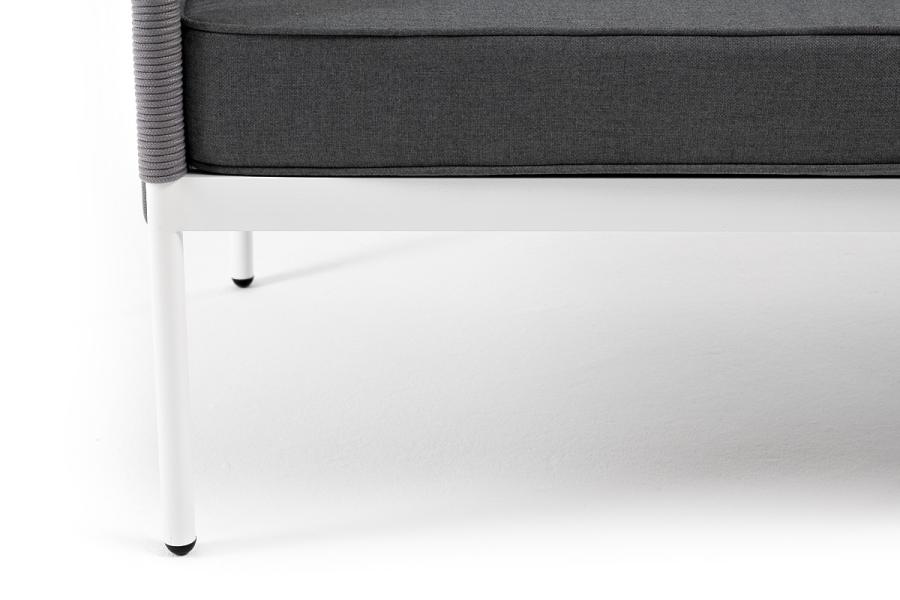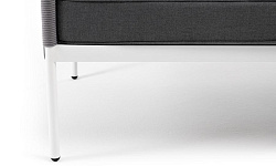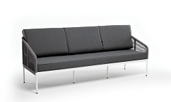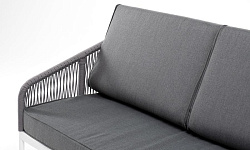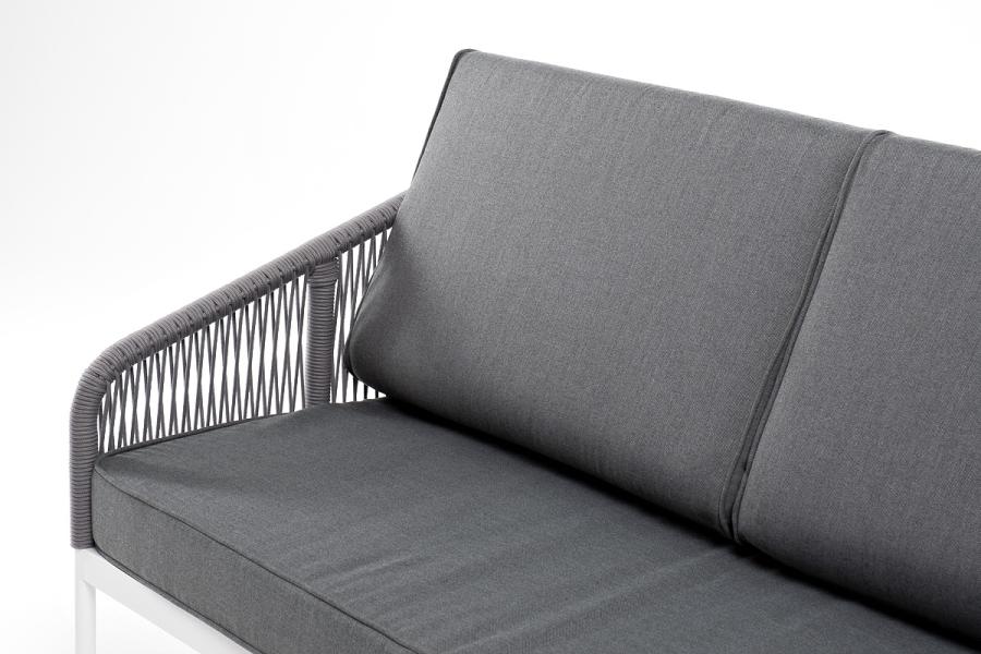Диван имеет алюминиевый каркас, окрашенный порошковой краской в белый цвет. Боковины каркаса и спинка вручную оплетены роупом - эластичными синтетическими лентами, изготовленными из высокопрочных полиэфирных волокон. Цвет оплетки - светло-серый.