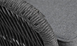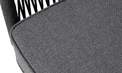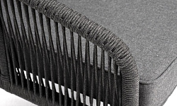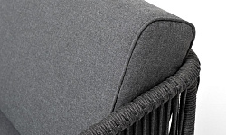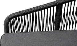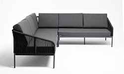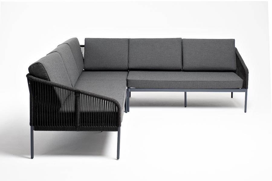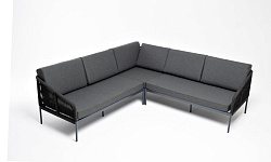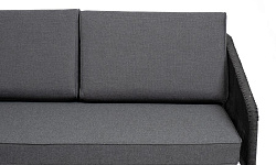 Диван имеет алюминиевый каркас, окрашенный порошковой краской в темно-серый (RAL7024) цвет. Боковины каркаса вручную оплетены роупом - эластичными синтетическими лентами, изготовленными из высокопрочных полиэфирных волокон. Цвет оплетки - темно-серый.