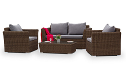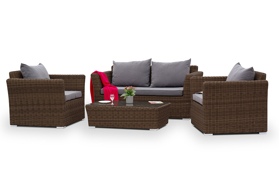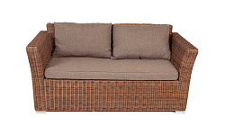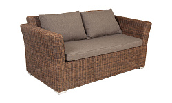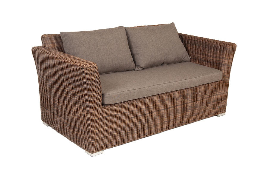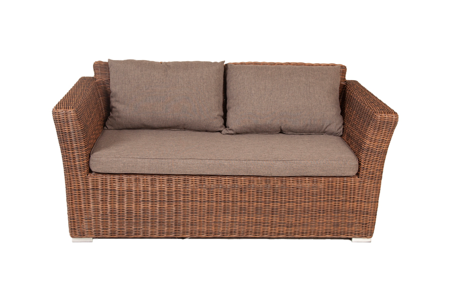 Диван выполнен из искусственного ротанга натурального коричневого цвета с помощью ручного круглого плетения.