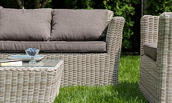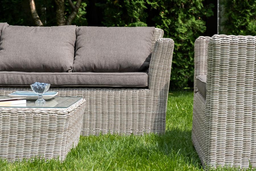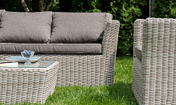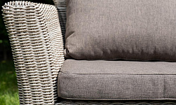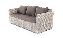 Диван из искусственного ротанга «Капучино» в своей основе имеет каркас из алюминия, который оплетен вручную круглым плетением бежевого цвета.