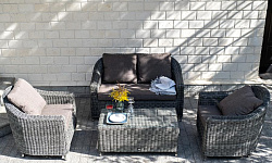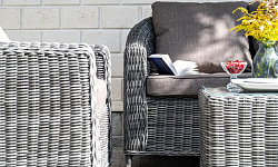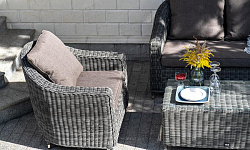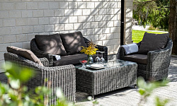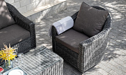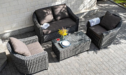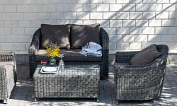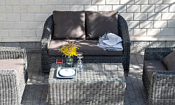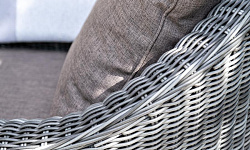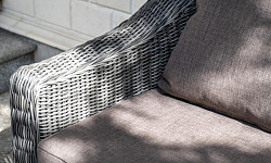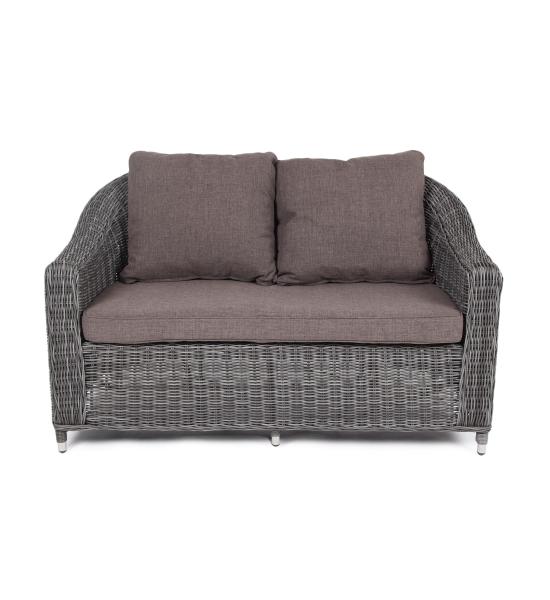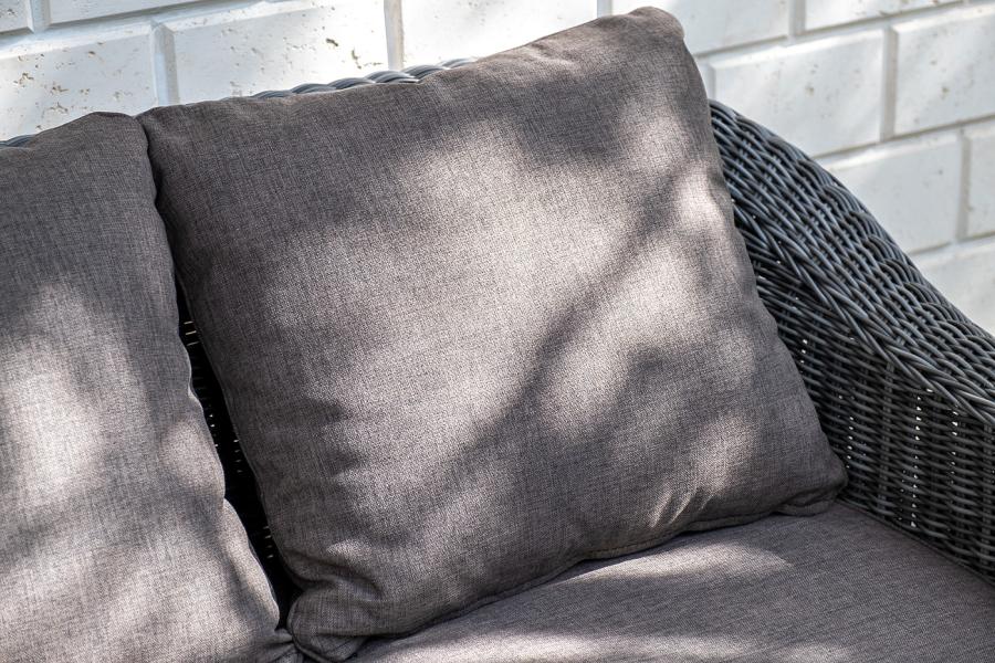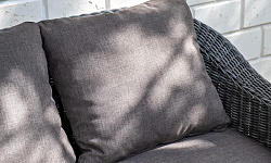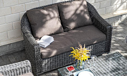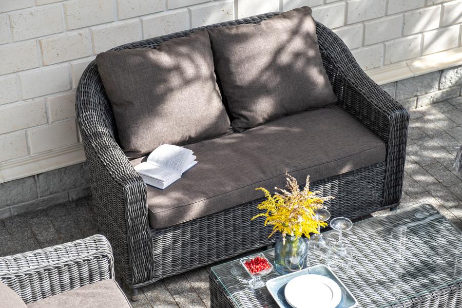Диван из искусственного ротанга графитового цвета «Кон Панна» дает возможность комфортно расположить две персоны благодаря комплектным подушкам из полиэстера с влагоотталкивающей пропиткой.