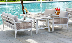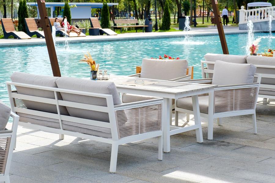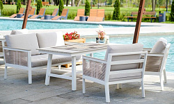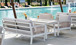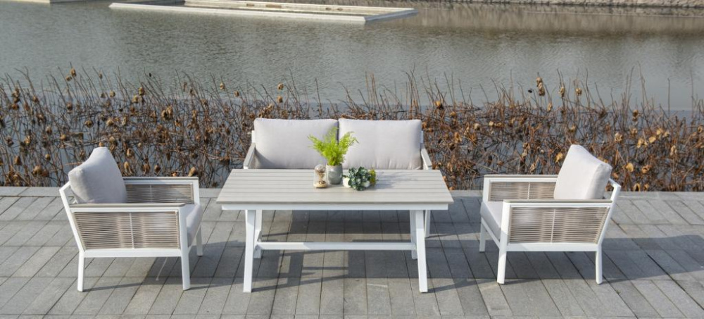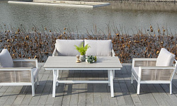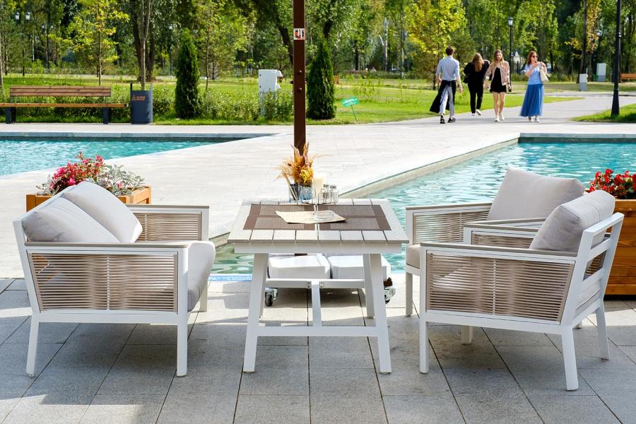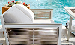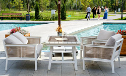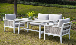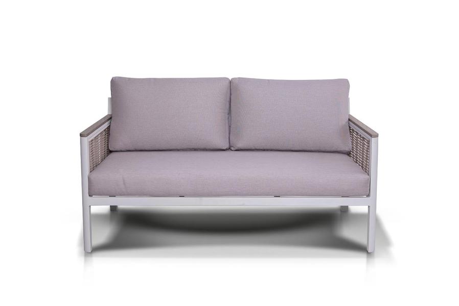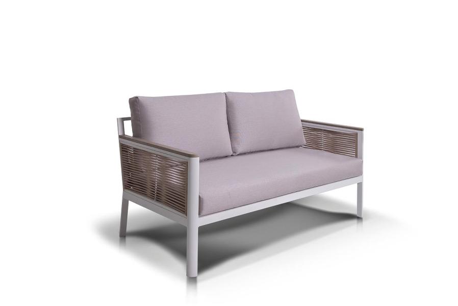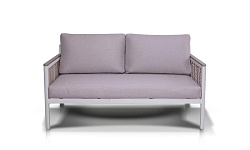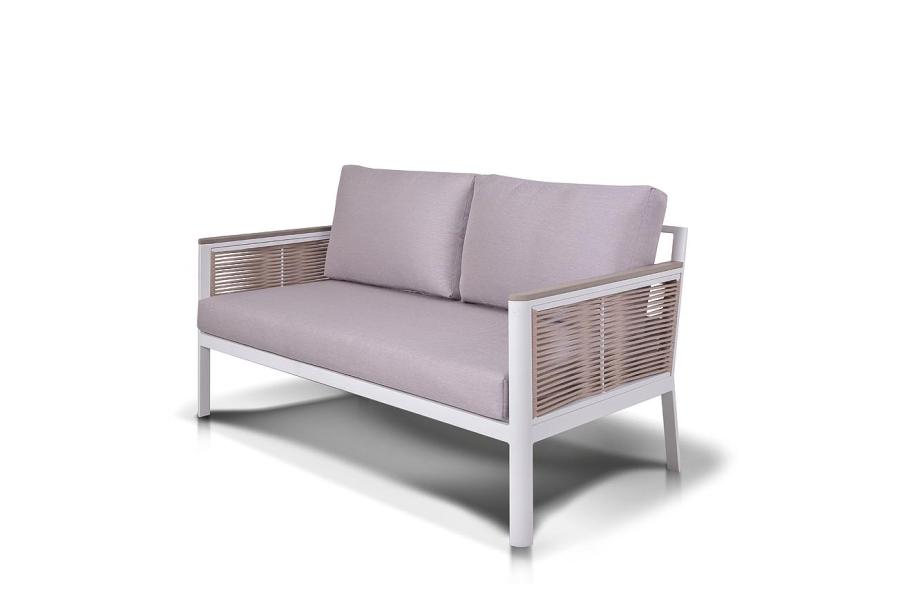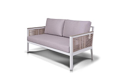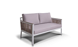 Каркас выполнен из высококачественного алюминия и окрашен порошковой краской в белый цвет. Боковые стороны подлокотников вручную оплетены эластичными синтетическими лентами серо-коричневого оттенка, состоящие из высокопрочных полиэфирных волокон.