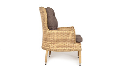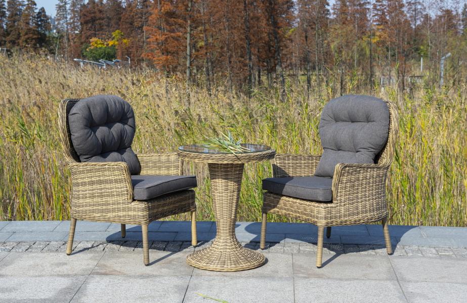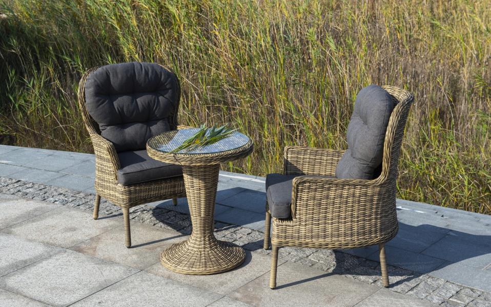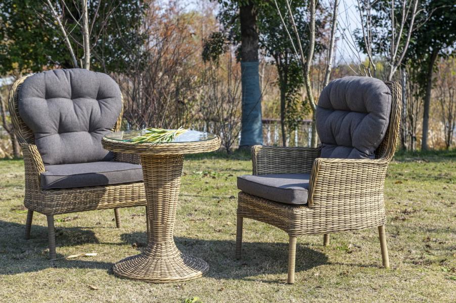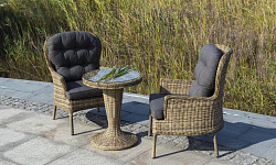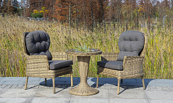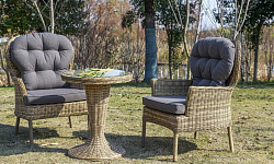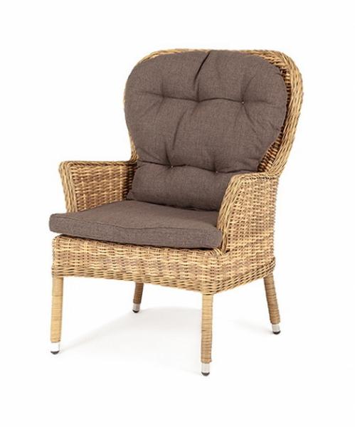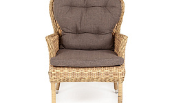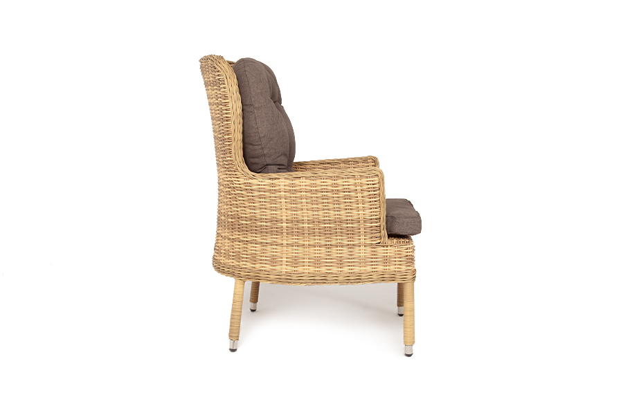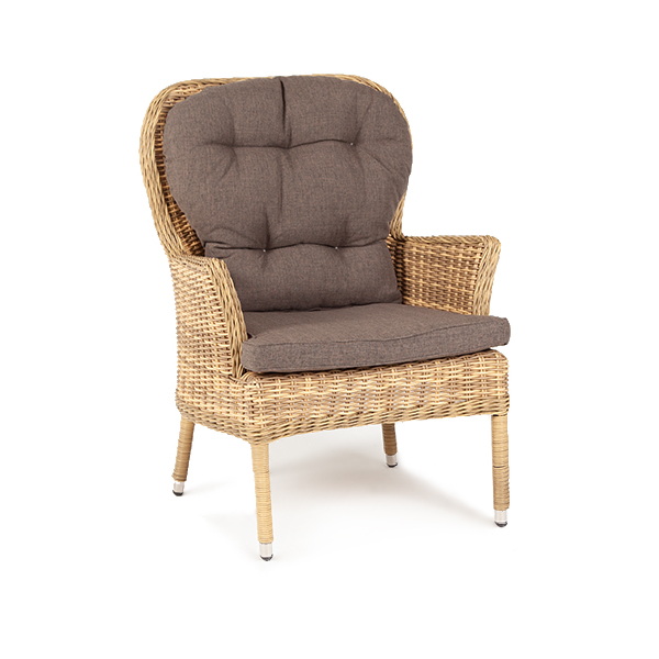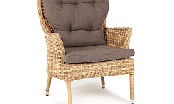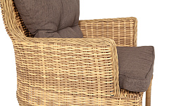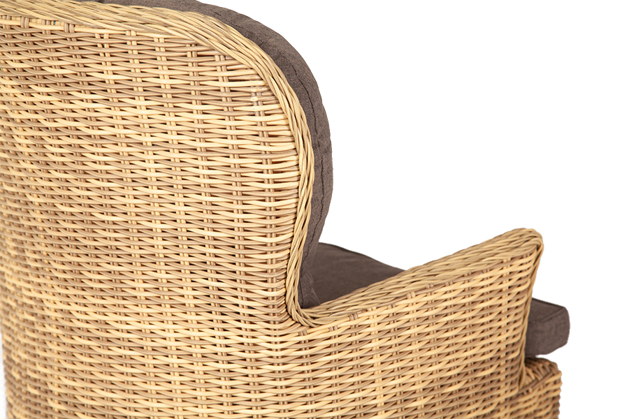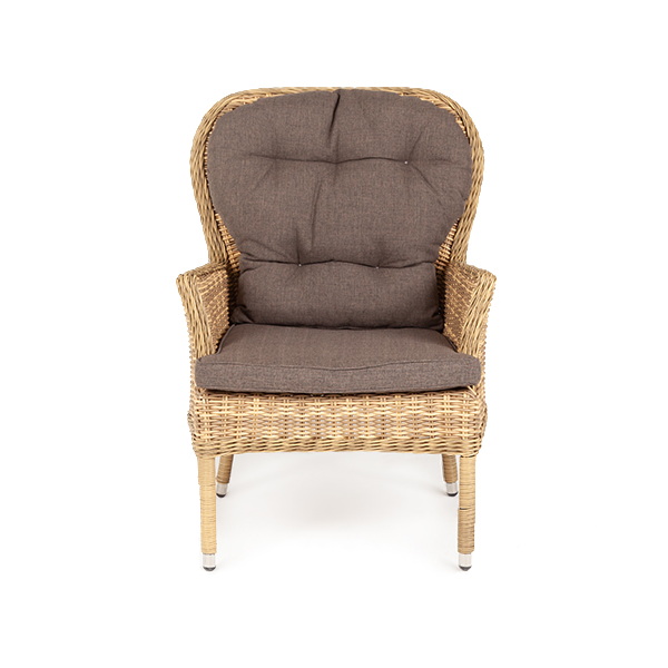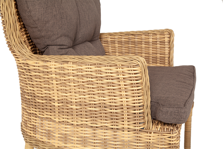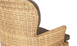 В садовое кресло укомплектовывается мягкими подушками. Они пошиты из износостойкого полиэстера серо-коричневого оттенка с плотностью 230гр/м2. Защитные свойства синтетического материала усиливаются благодаря влагоотталкивающей пропитке.