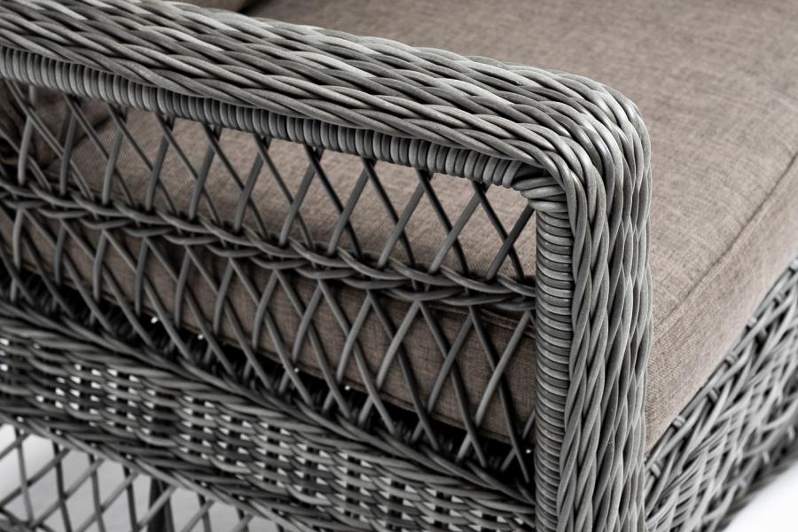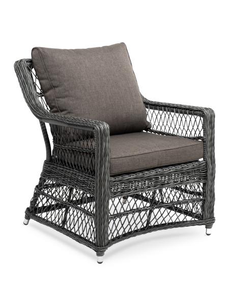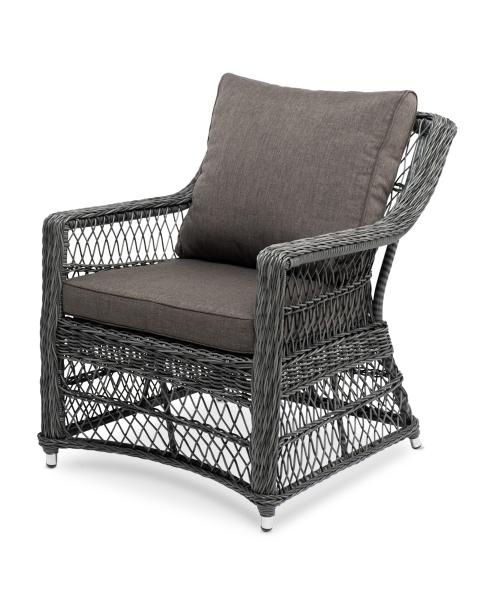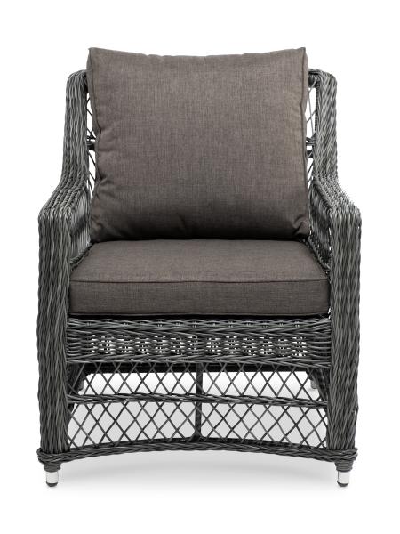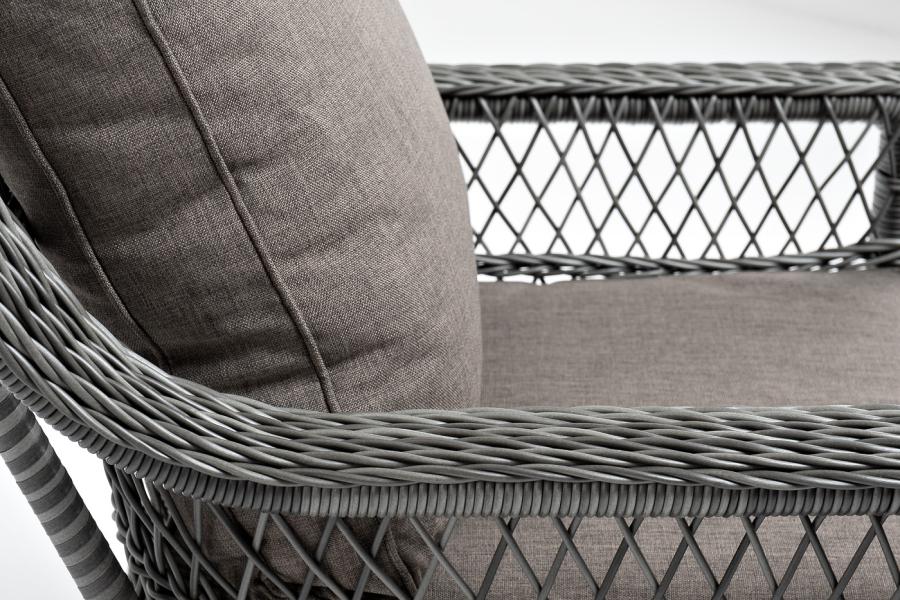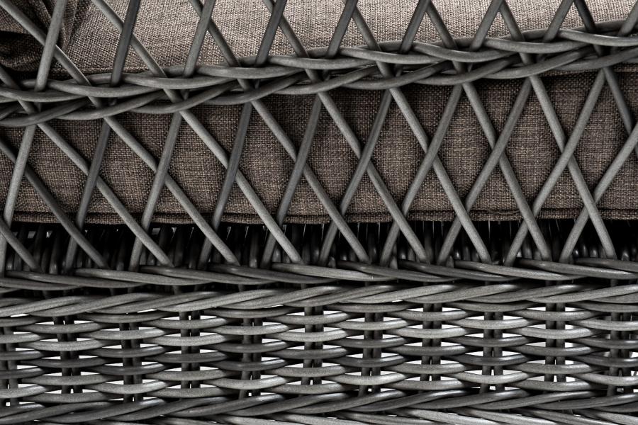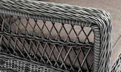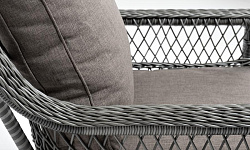 Кресло изготовлена из устойчивого алюминиевого каркаса. Искусственный ротанг украшает мебель в качестве круглого ручного плетения. Оно представлено в цвете "графит".