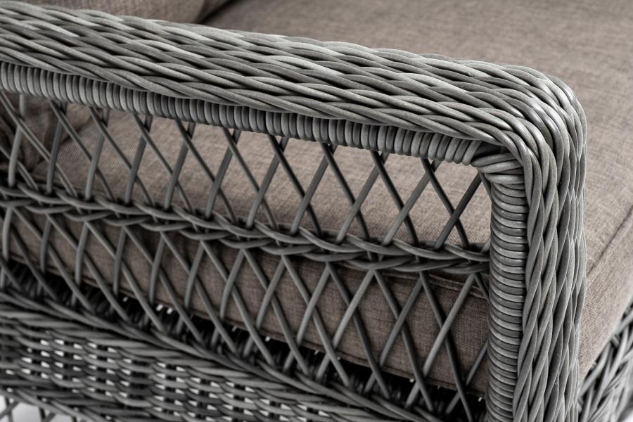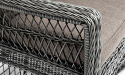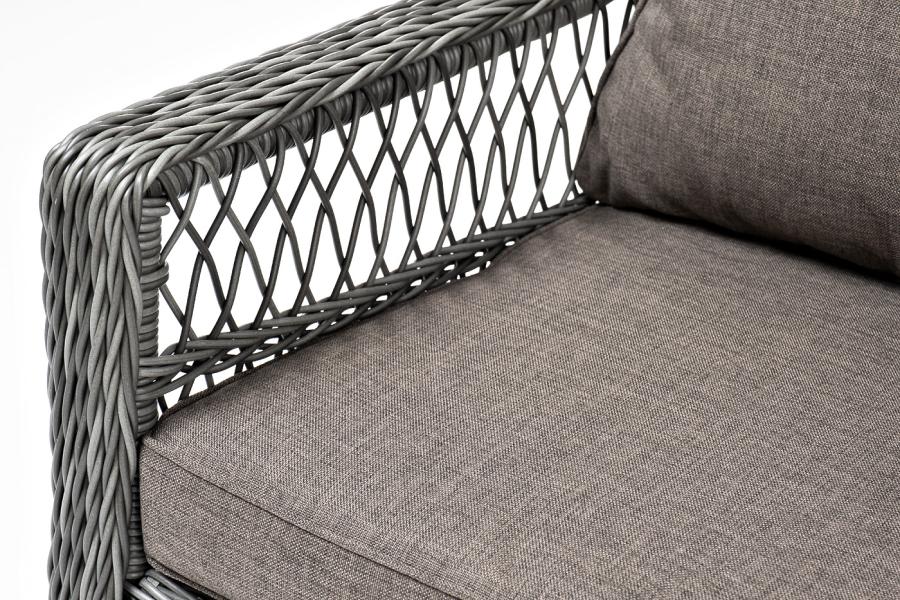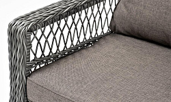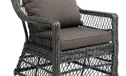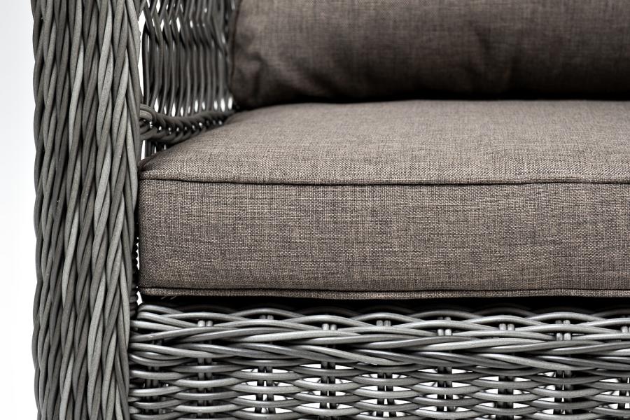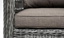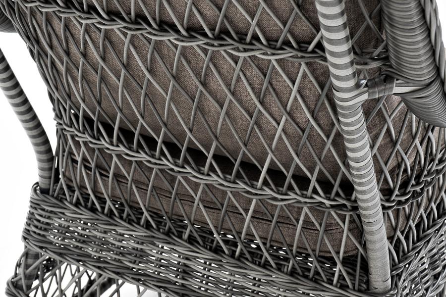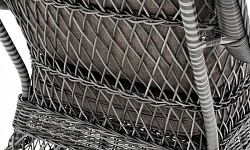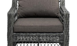 Укомплектовано плетеное кресло удобными мягкими подушками, одна из которых располагается в области спинки. Они выполнены в серо-коричневом оттенке. При пошиве тканевых изделий используется полиэстер, плотностью 230гр/м2. Он в обязательном порядке проходит обработку влагоотталкивающей пропиткой.