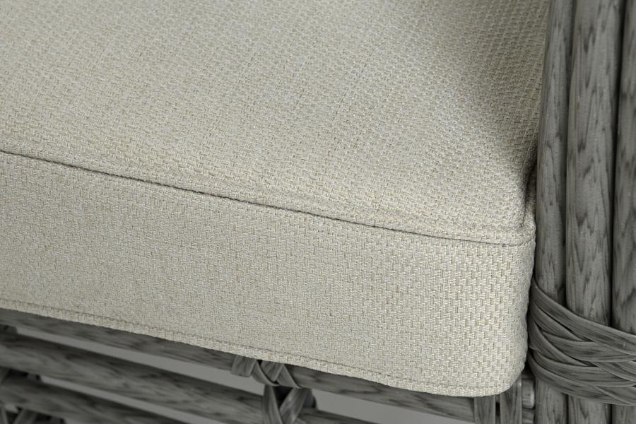 Садовое кресло укомплектовано удобными бежевыми подушками. Полиэстер используется при пошиве тканевых изделий, плотность которого - 300гр/м2. Материал имеет обязательную влагоотталкивающую пропитку для усиления его защитных свойств.