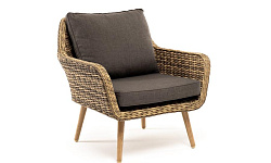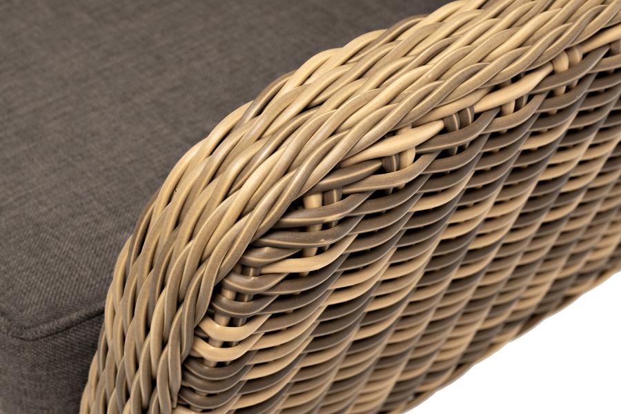 Надежность и износостойкость мебели гарантирует каркас, который сделан из качественного алюминия. Ее дополняет ручное плетение, при изготовлении которого используется искусственный ротанг. Представлена модель в соломенном цвете.