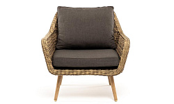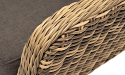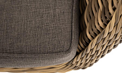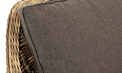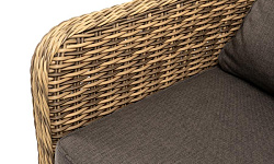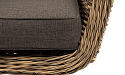 В комплекте с уличным ротанговым креслом идут мягкие подушки со съёмными чехлами серо-коричневого оттенка. Они пошиты из полиэстера, который не боится повышенной влажности благодаря наличию влагоотталкивающей пропитки. Плотность ткани составляет 230гр/м2.