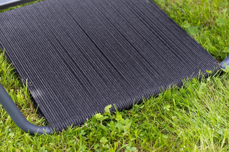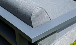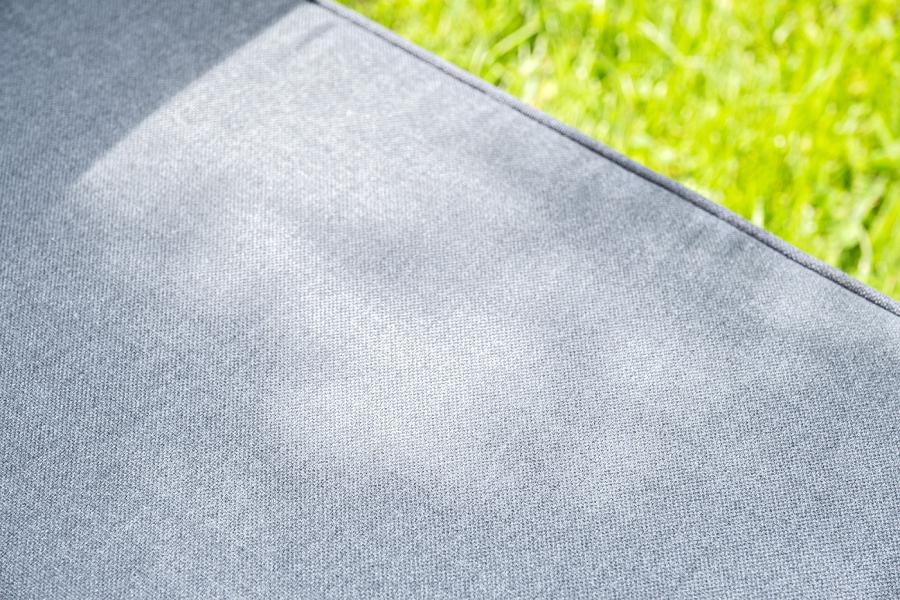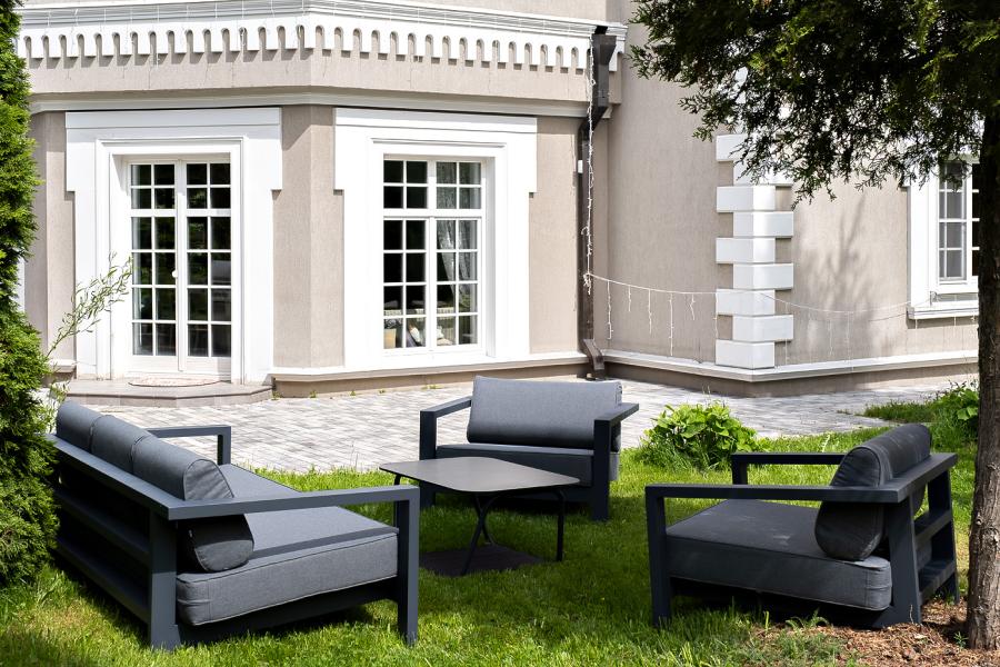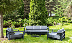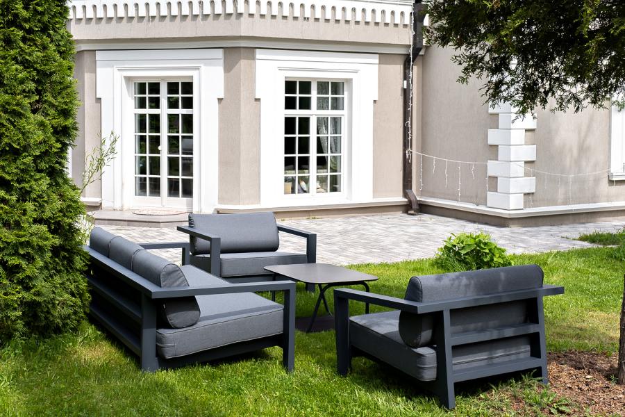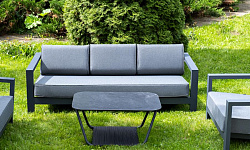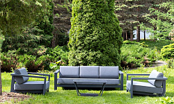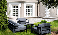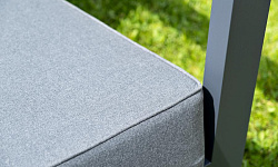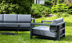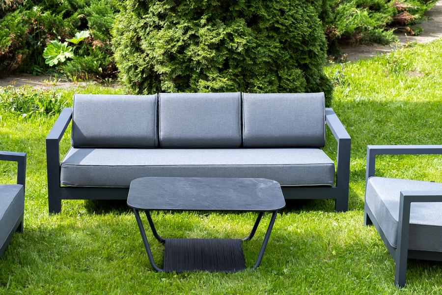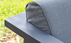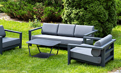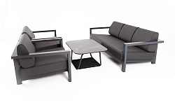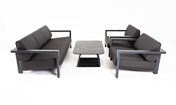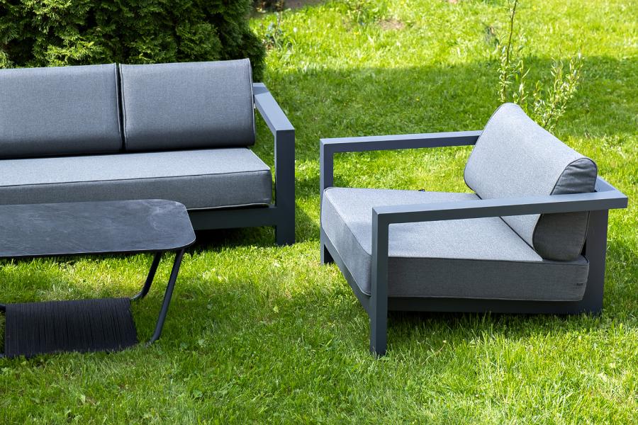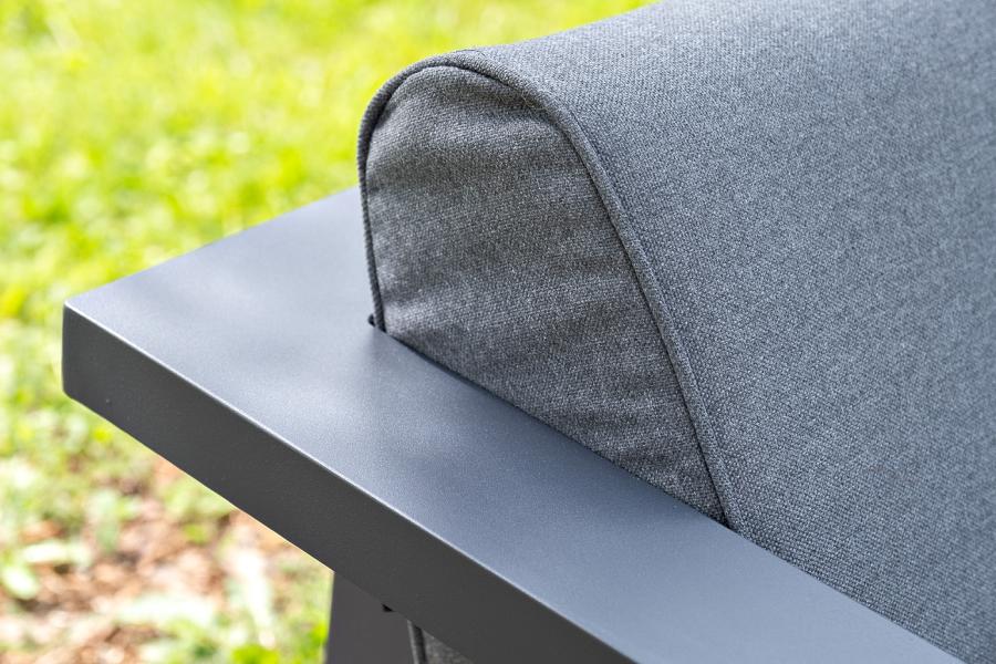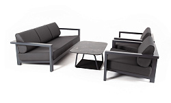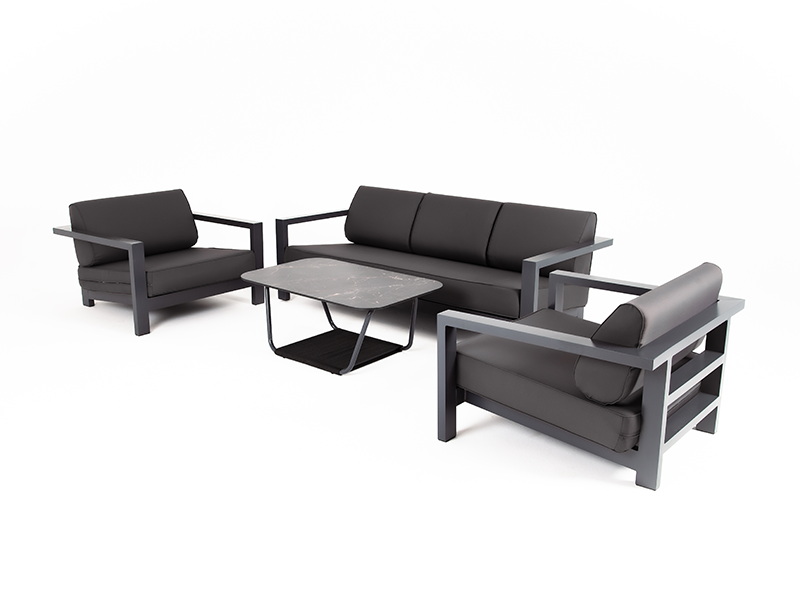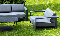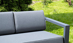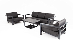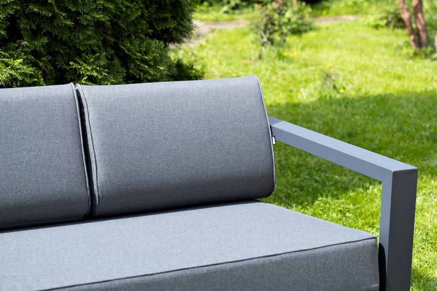Каркас мебели выполнен из алюминиевого профиля, окрашенного в темно-серый (RAL7024) цвет. Дополняют комплект подушки со съёмными чехлами.