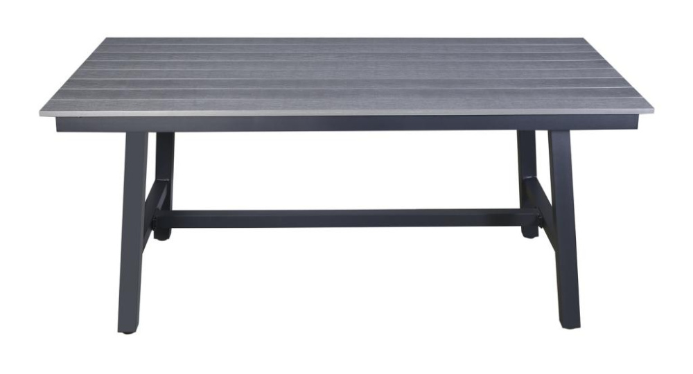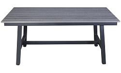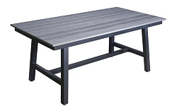 Подстолье изготовлено из легкого алюминия, окрашенного в темно-серый цвет износостойкой порошковой краской, столешница – из композитного материала ДПК серого цвета.