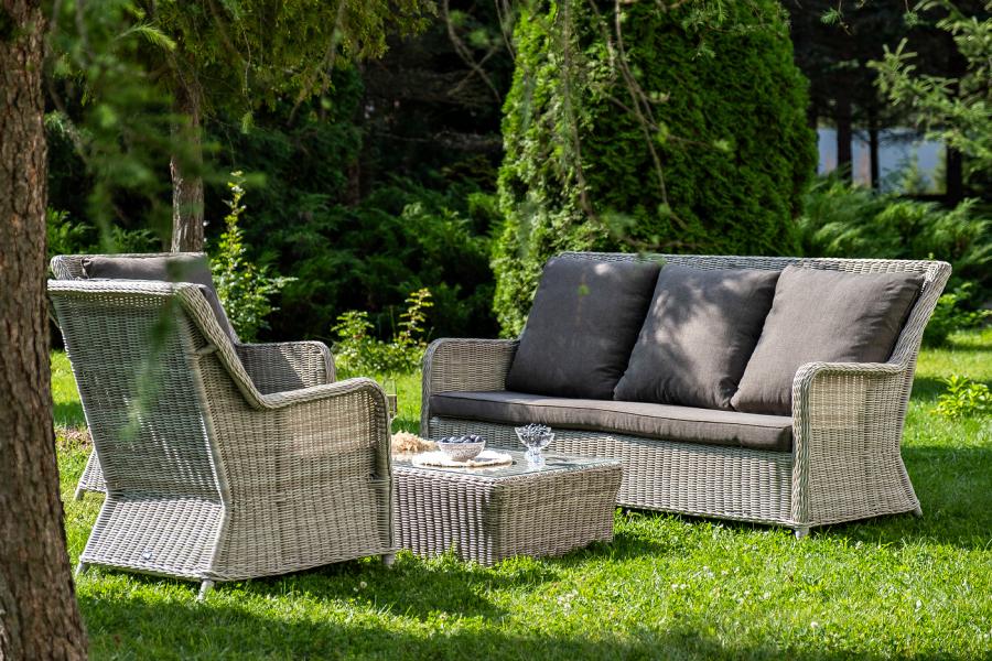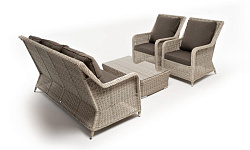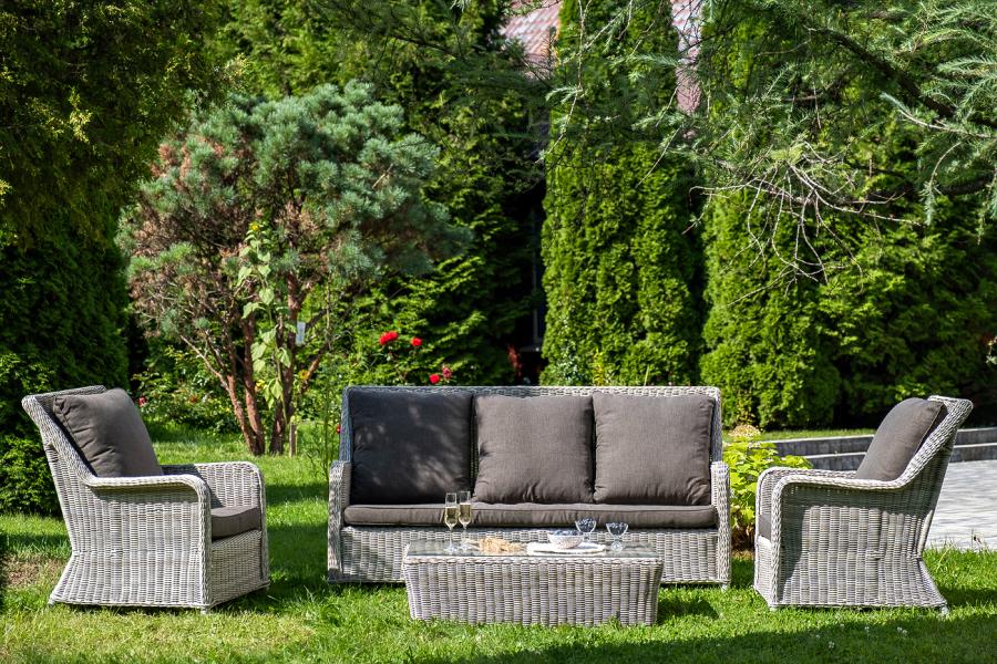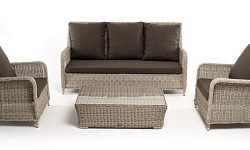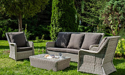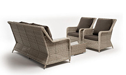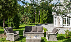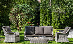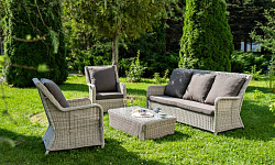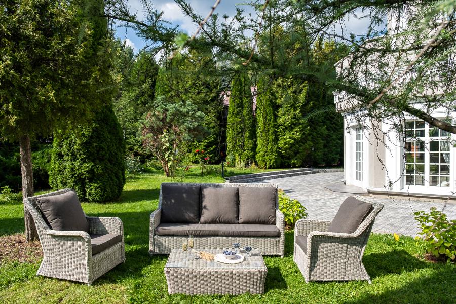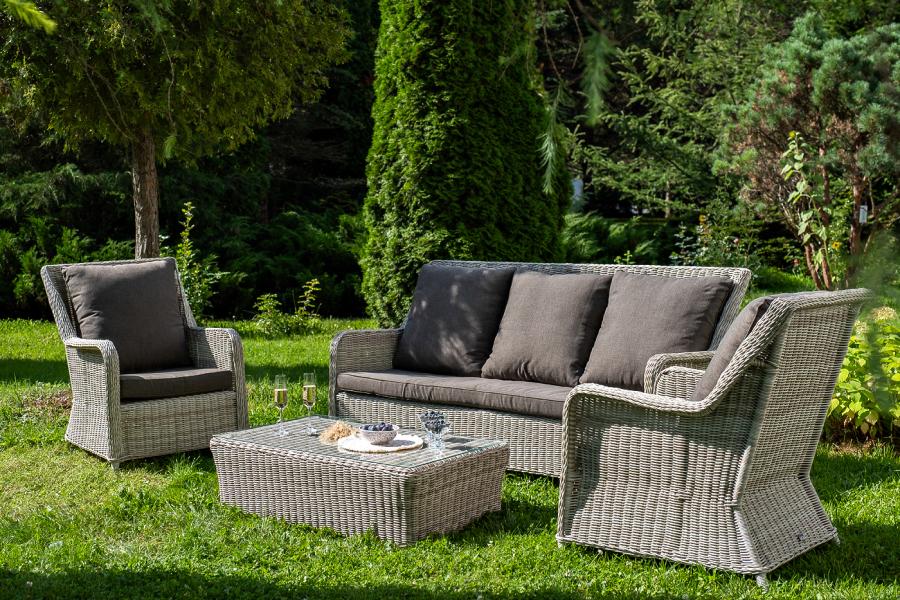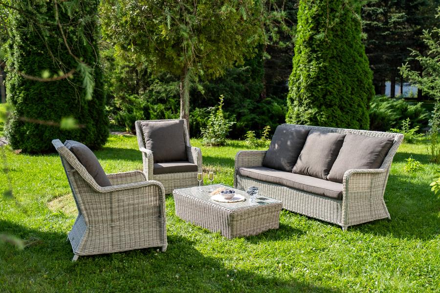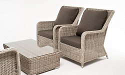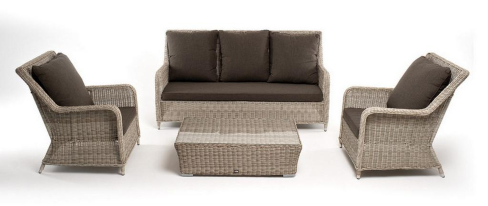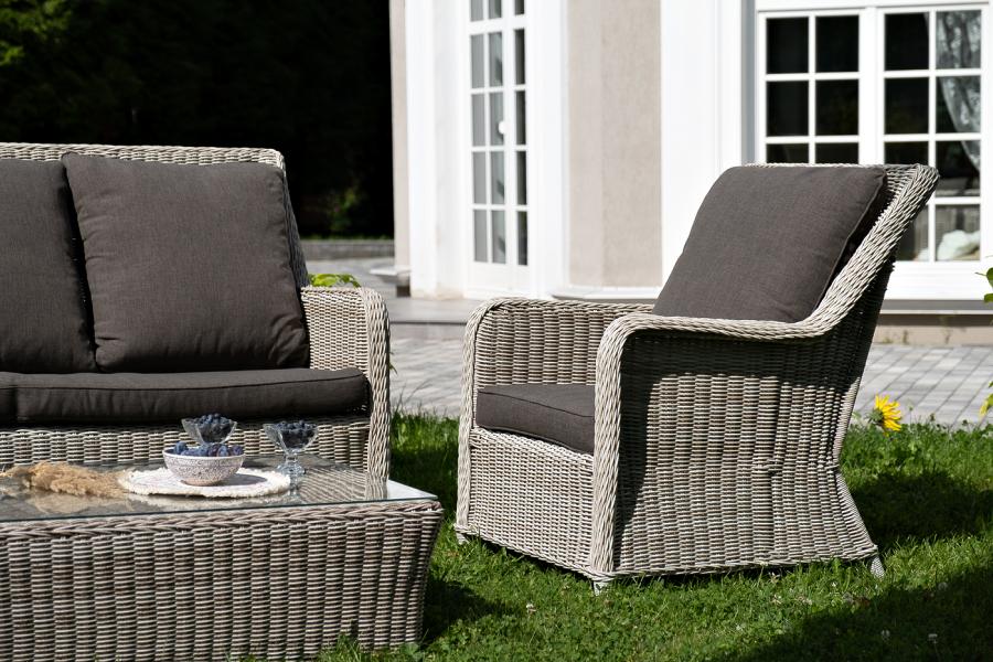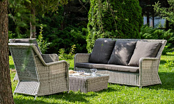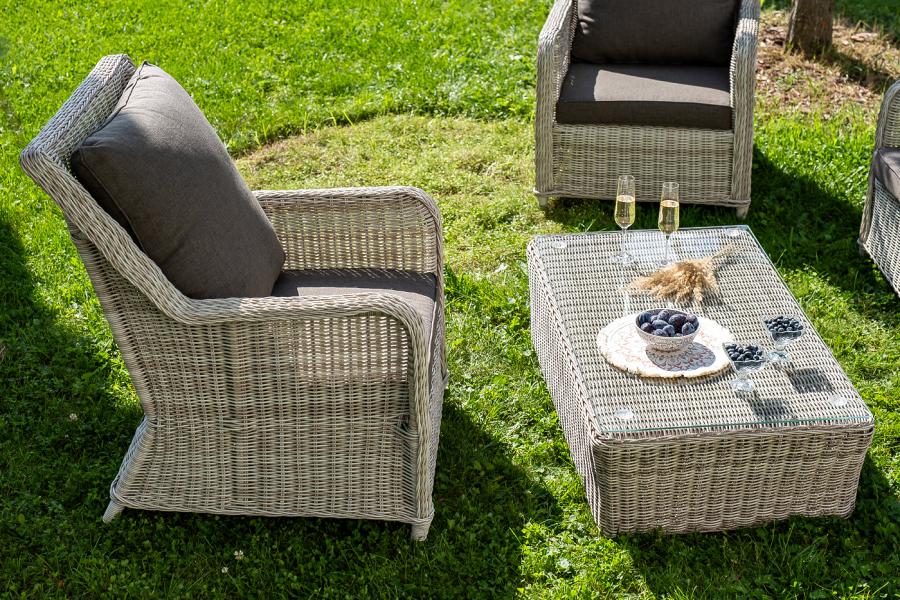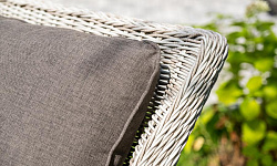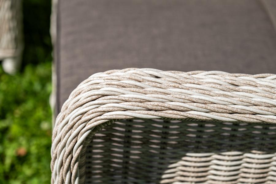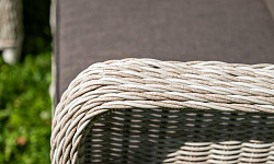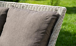 Плетеная мебель дополнена удобными подушками в серо-коричневых чехлах. При их изготовлении используют полиэстер, плотность – 230гр/м2. Он обрабатывается влагоотталкивающей пропиткой для повышения защитных свойств материала.