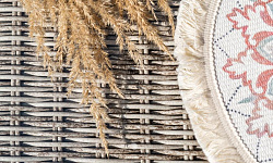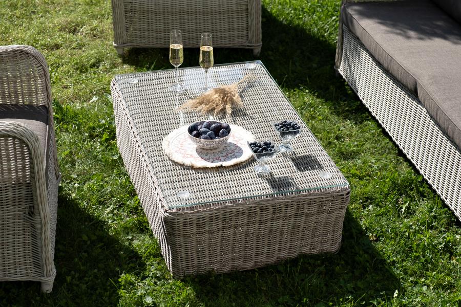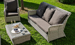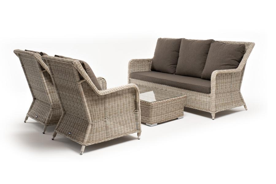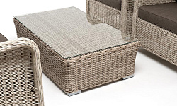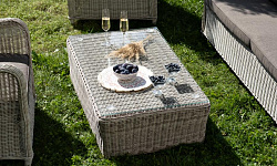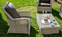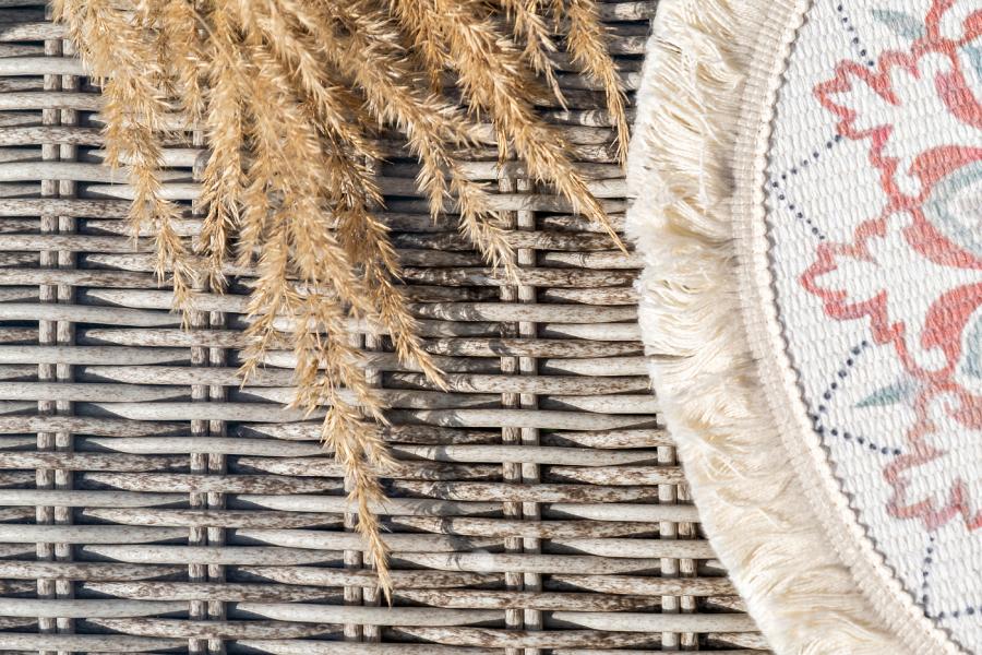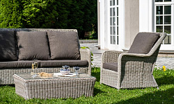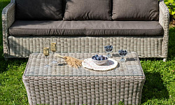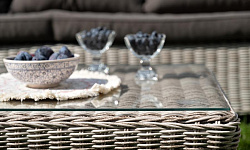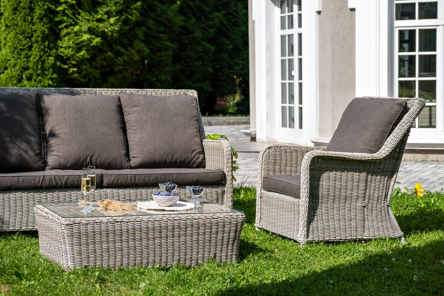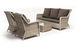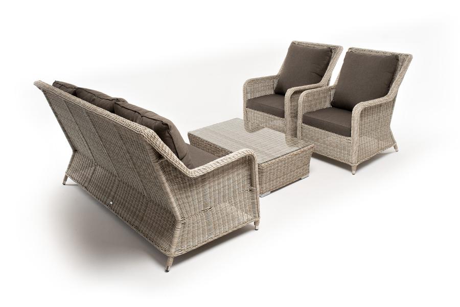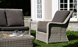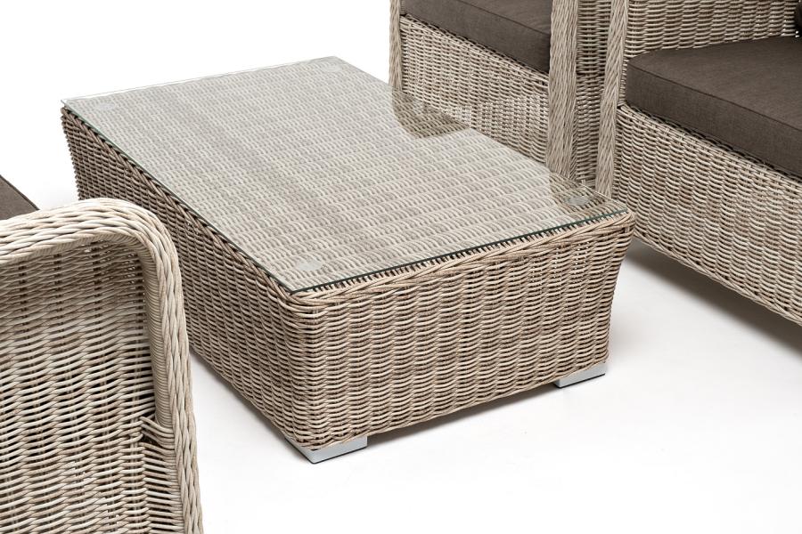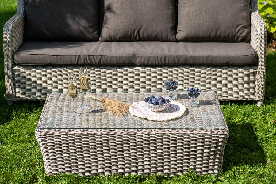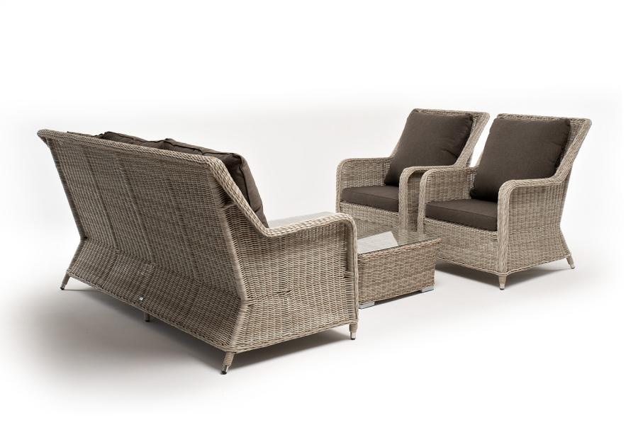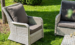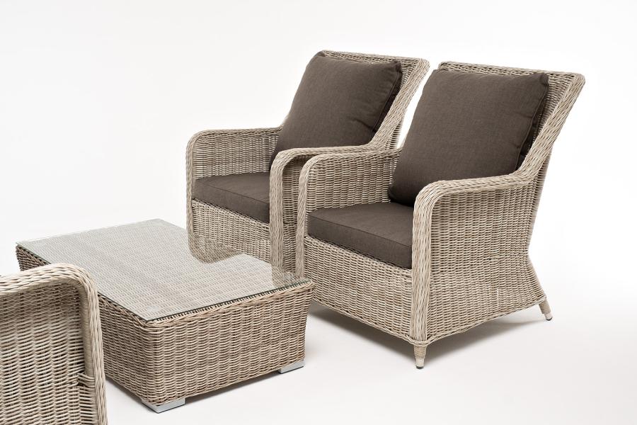 Плетеная мебель дополнена удобными подушками в серо-коричневых чехлах. При их изготовлении используют полиэстер, плотность – 230гр/м2. Он обрабатывается влагоотталкивающей пропиткой для повышения защитных свойств материала.
