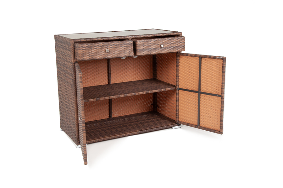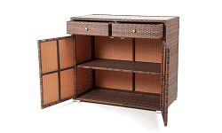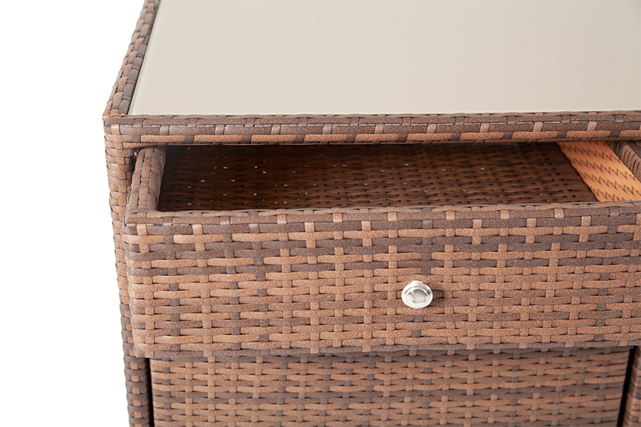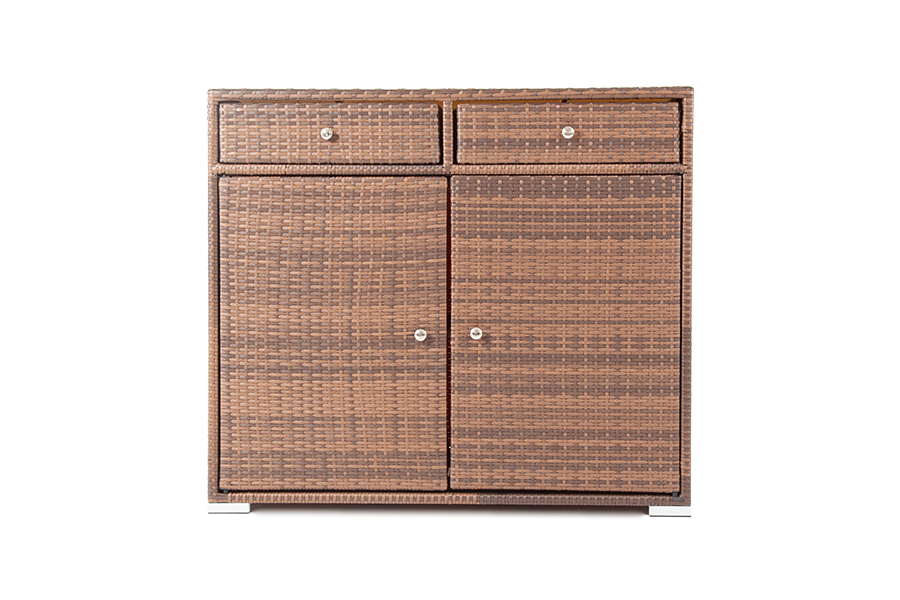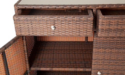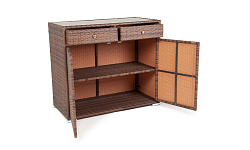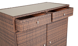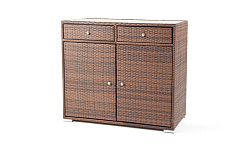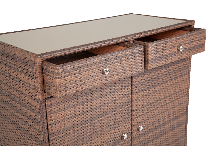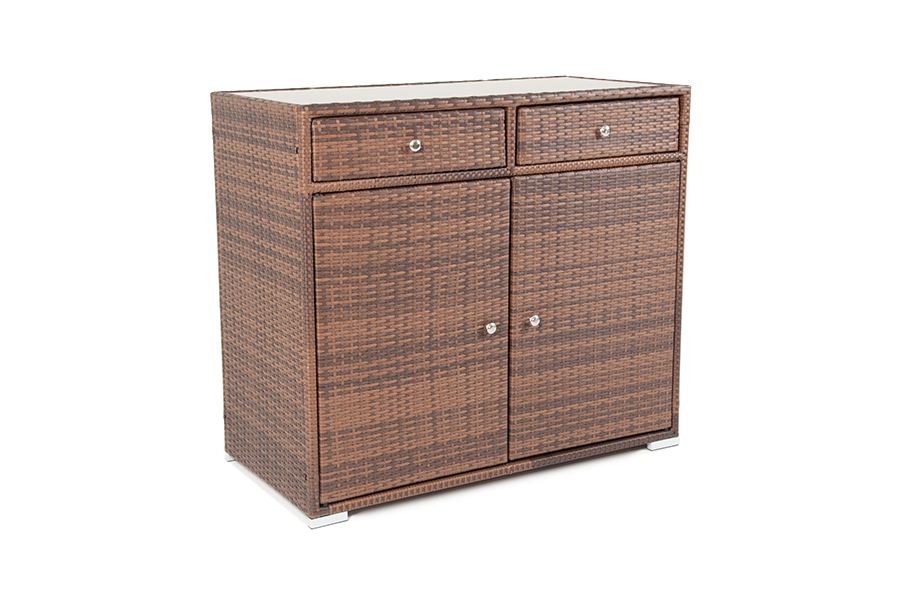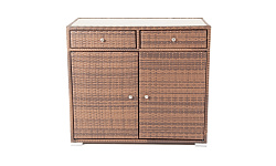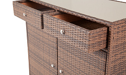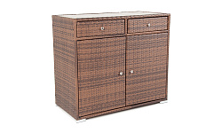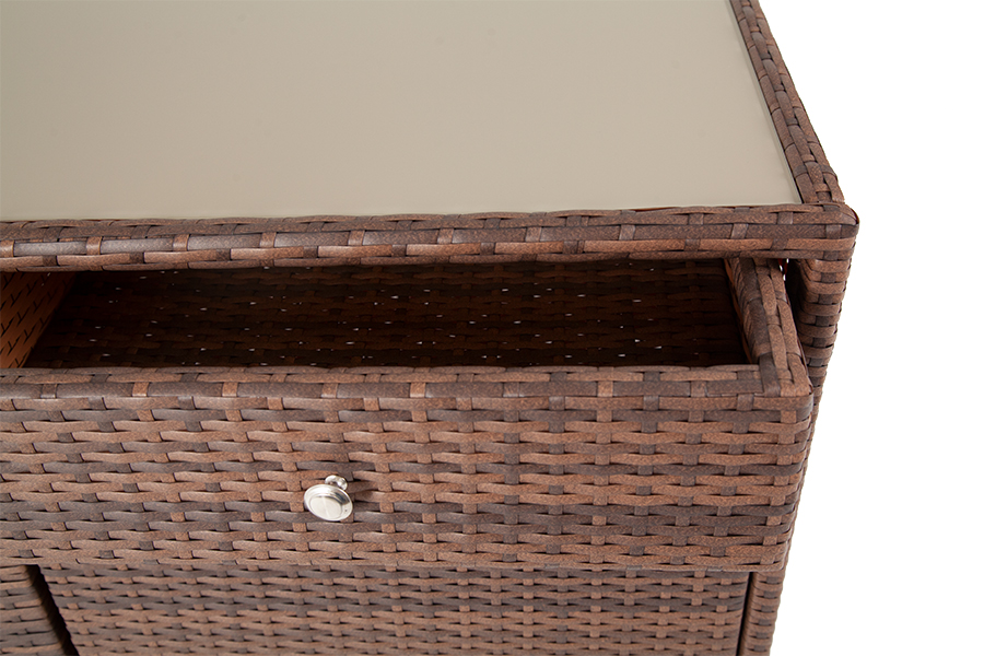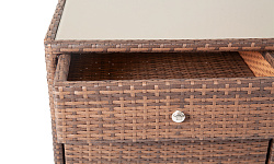 «Мальта» тумба изготовлена из алюминиевого каркаса, оплетенного плоским искусственным ротангом коричневого цвета.