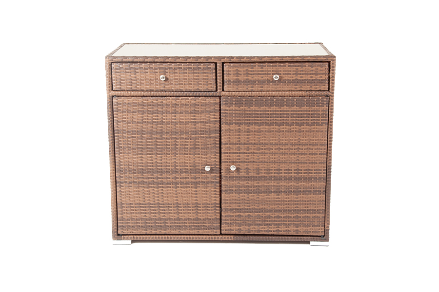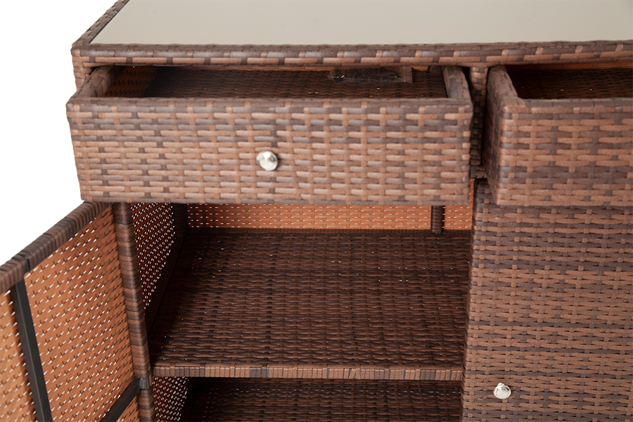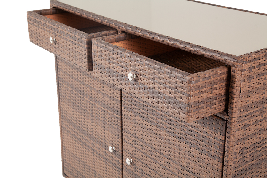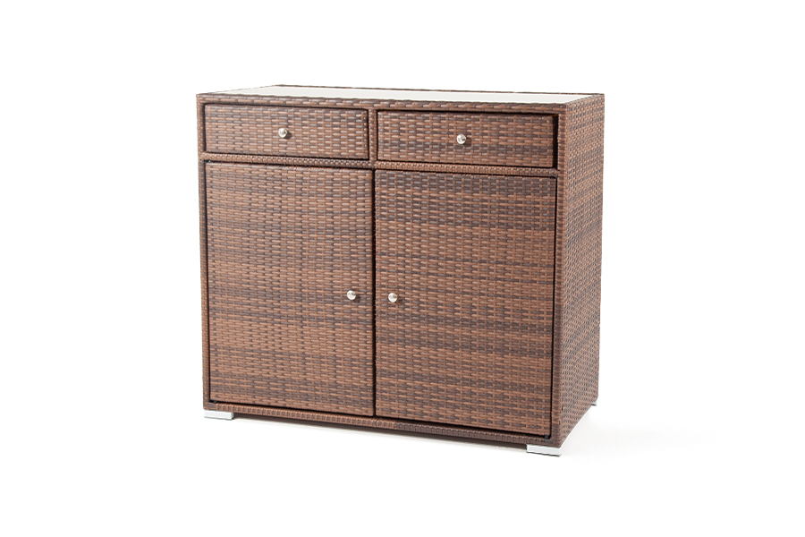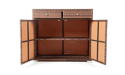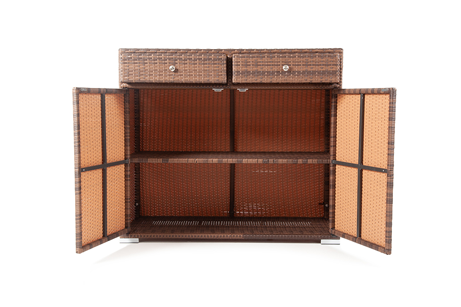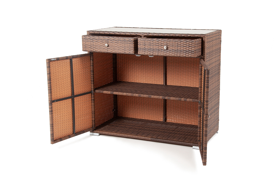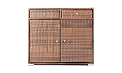 «Мальта» тумба изготовлена из алюминиевого каркаса, оплетенного плоским искусственным ротангом коричневого цвета.