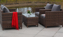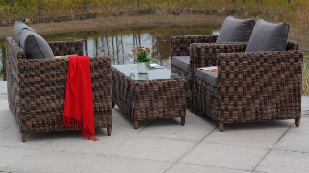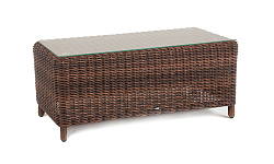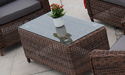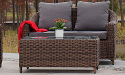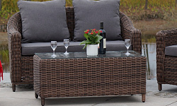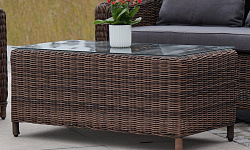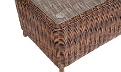 В основе мебели находится алюминиевый каркас высокой прочности. Декоративной составляющей является ручная круглая оплетка, которая выполнена из искусственного ротанга. Столик представлен в шоколадном цвете.