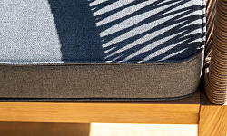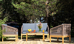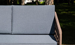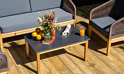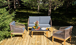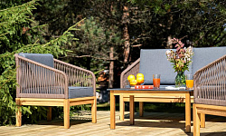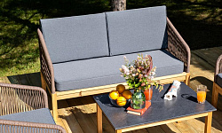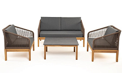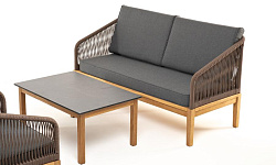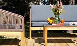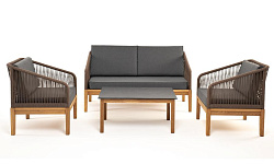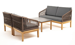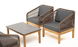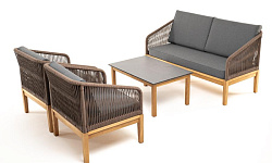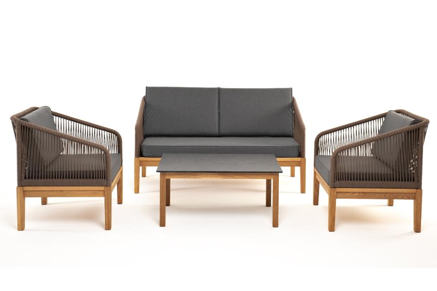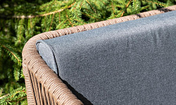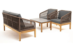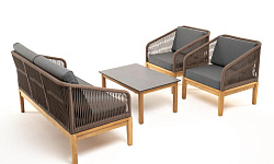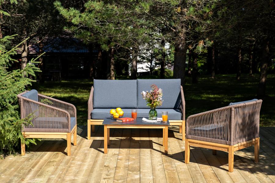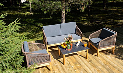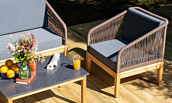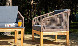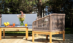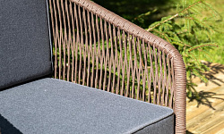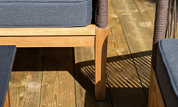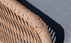 Каркас уличной мебели выполнен из дуба. Его дополняет коричневая оплетка, изготовленная на основе эластичных синтетических лент из полиэфирных волокон высокой прочности.