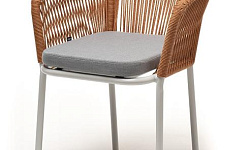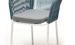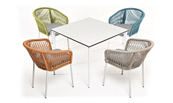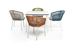 Каркас стульев выполнен из алюминия. Оплетка выполнена вручную современным материалом - роупом. Цвет оплетки - бирюзовый, салатовый меланж, оранжевый меланж и серый меланж. В комплект входят подушки со съёмными водоотталкивающими чехлами светло-серого цвета.