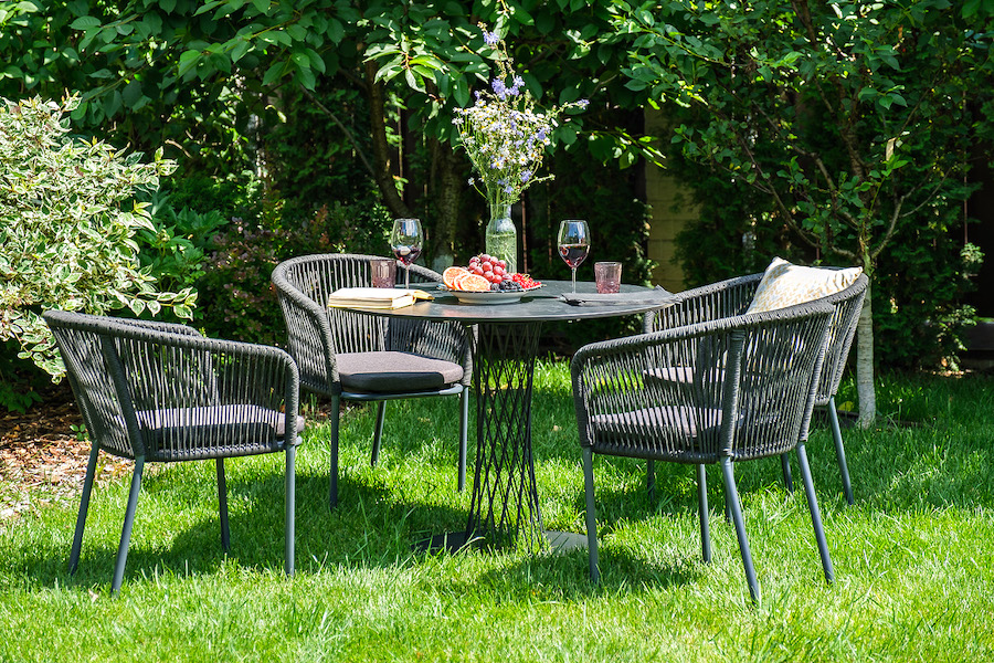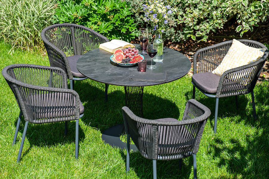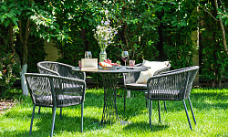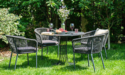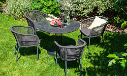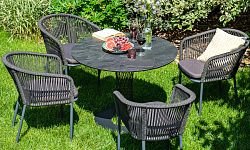 4 кресла из коллекции «Марсель», выполненных из алюминиевого каркаса и ручной оплетки роупом. Это эластичные синтетические ленты из высокопрочных полиэфирных волокон, представлены в темно-сером цвете.