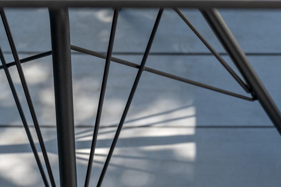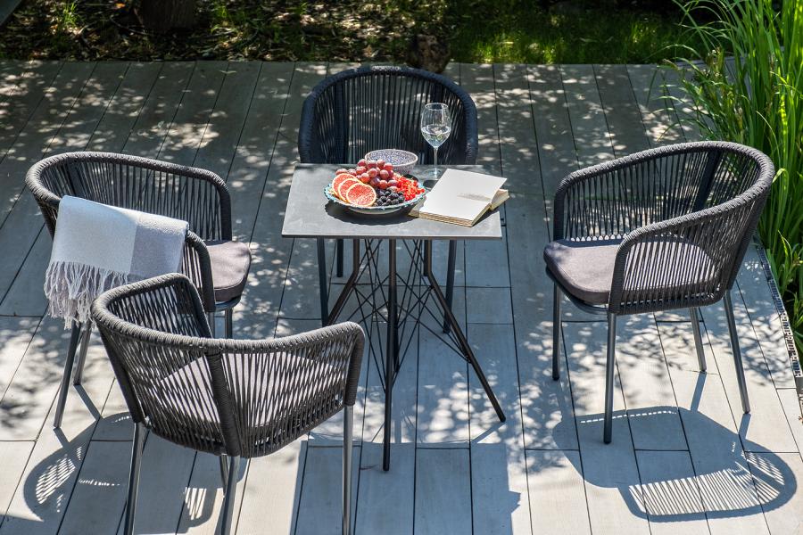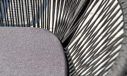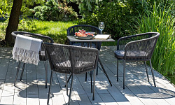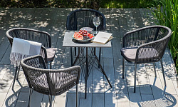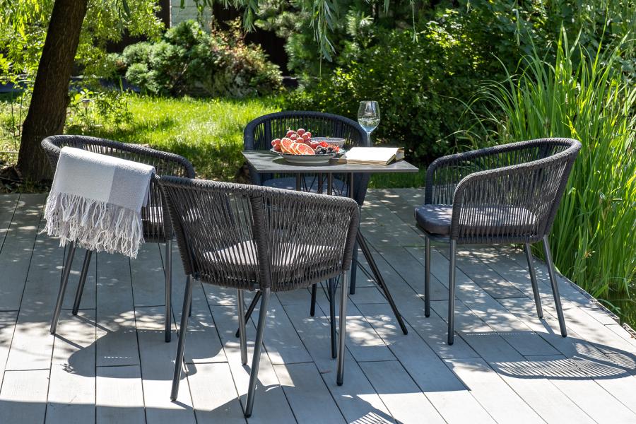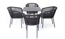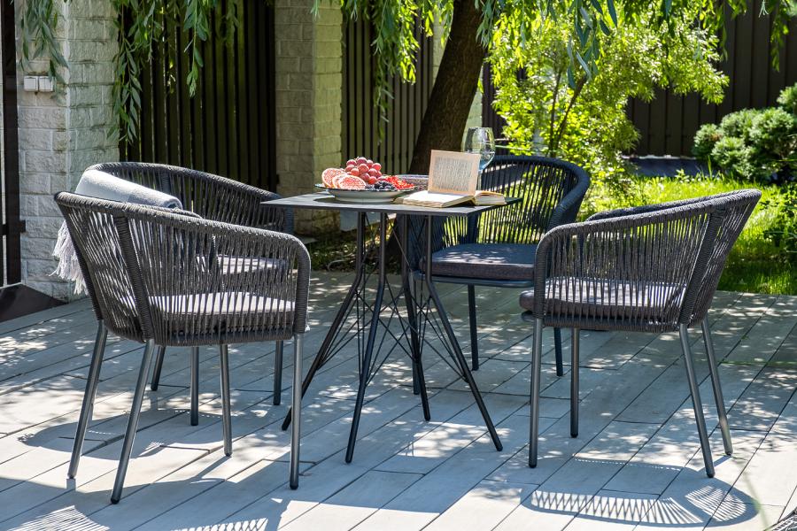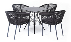 4 кресла из коллекции «Марсель», выполненных из алюминиевого каркаса и ручной оплетки роупом. Это эластичные синтетические ленты из высокопрочных полиэфирных волокон, представлены в темно-сером цвете.
